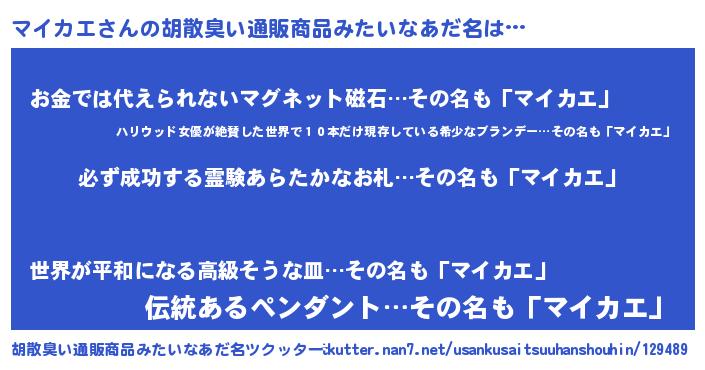 | 男性向けラノベタイトル風あだ名 | 『マイカエの憂鬱』『魔弾の王とマイカエ』 |