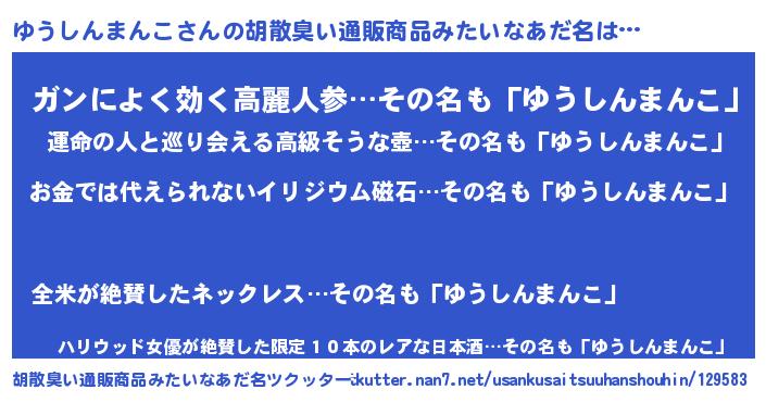 | 男性向けラノベタイトル風あだ名 | 『おまえをオタクにしてやるから、俺をゆうしんまんこにしてくれ! 』 |