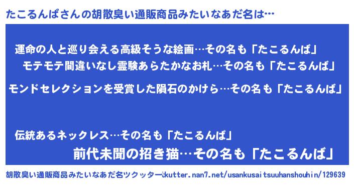 | 男性向けラノベタイトル風あだ名 | 『たこるんば~年齢イコール彼女いない歴の魔法使い~』 |