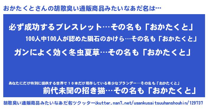 | 意味不明あだ名 | 『自称おかたくと』『ペロリンおかたくと』 |