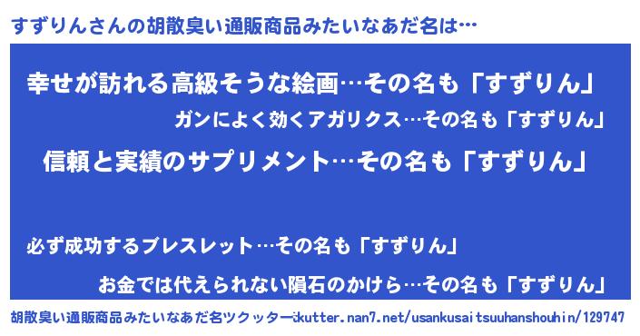 | 男性向けラノベタイトル風あだ名 | 『ダンジョンにすずりんを求めるのは間違っているだろうか』 |
