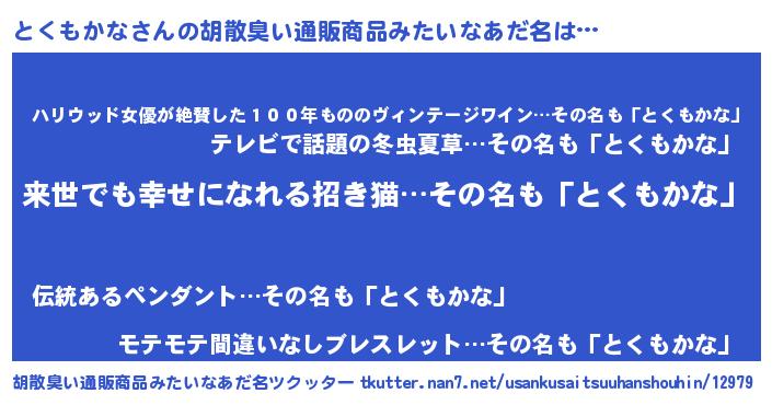 | 男性向けラノベタイトル風あだ名 | 『とくもかなという概念が存在しない退屈な世界 』 |