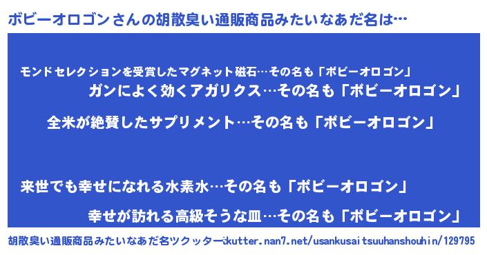 | 男性向けラノベタイトル風あだ名 | 『ボビーオロゴンの嫁は女の子じゃないと思った?』 |