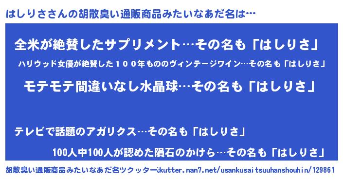 | ヒーロー風カッコイイあだ名 | 『スーパーハシリサ』『銀牙騎士ハシ』 |