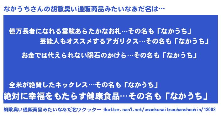 | 男性向けラノベタイトル風あだ名 | 『転生したらなかうちだった件』 |