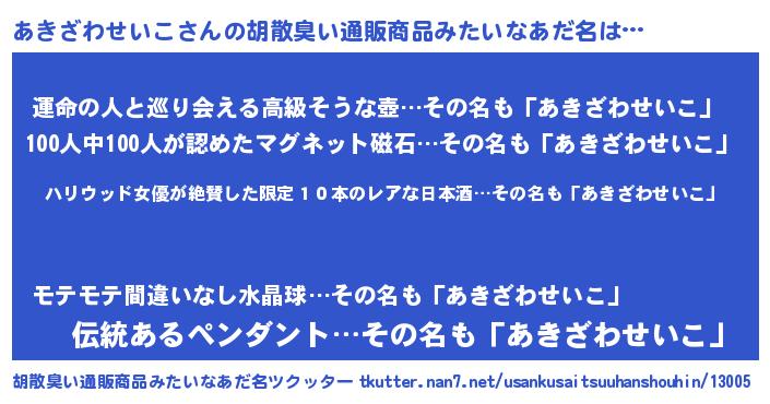 | 意味不明あだ名 | 『住所不定無職あきざわせいこ(53歳)』 |