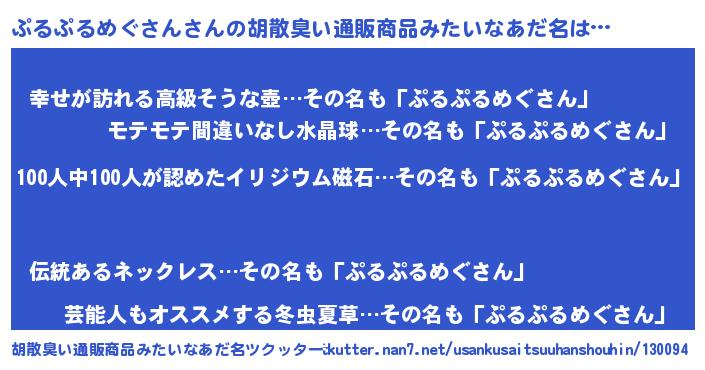 | 男性向けラノベタイトル風あだ名 | 『おまえをオタクにしてやるから、俺をぷるぷるめぐさんにしてくれ! 』 |