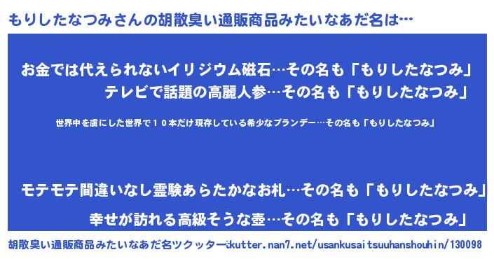 | 女子向けラノベタイトル風あだ名 | 『乙女ゲームの破滅フラグしかない悪役もりしたなつみに転生してしまった…』 |