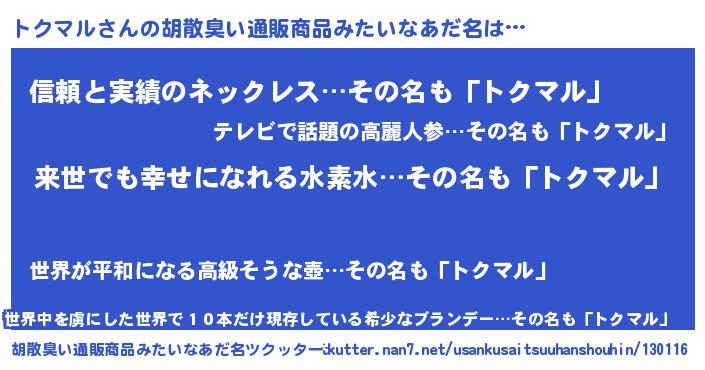 | 男性向けラノベタイトル風あだ名 | 『転生したらトクマルだった件』 |