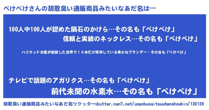 | 意味不明あだ名 | 『住所不定無職ぺけぺけ(77歳)』 |