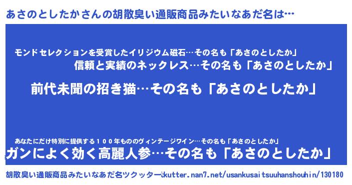 | 男性向けラノベタイトル風あだ名 | 『あさのとしたか~年齢イコール彼女いない歴の魔法使い~』 |