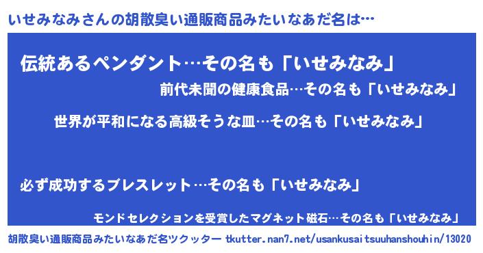 | 肩書あだ名 | 『いせみなみ中将』『いせみなみ国家主席』 |