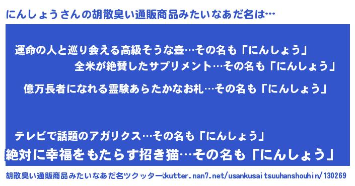 | 男性向けラノベタイトル風あだ名 | 『にんしょう~年齢イコール彼女いない歴の魔法使い~』 |