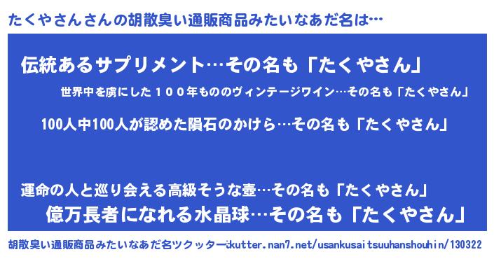 | 男性向けラノベタイトル風あだ名 | 『タクヤサンスレイヤー』 |