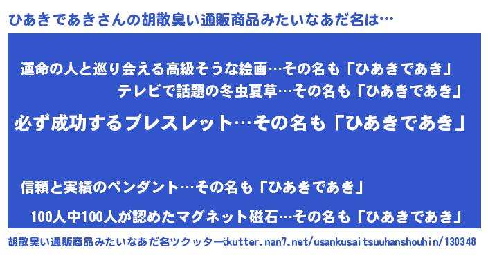 | 男性向けラノベタイトル風あだ名 | 『ひあきであきの憂鬱』 |