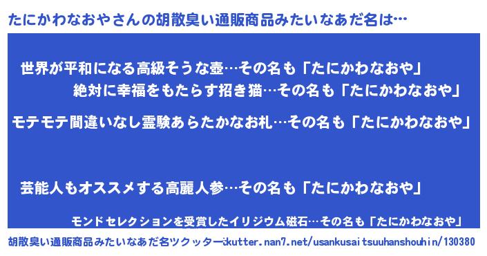 | 男性向けラノベタイトル風あだ名 | 『タニカワナオヤアートオンライン』 |