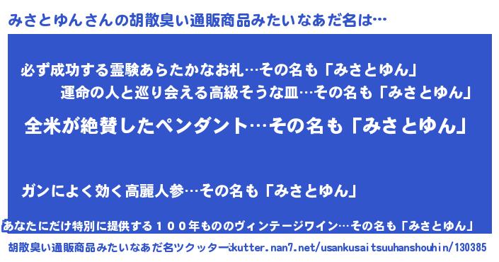 | 男性向けラノベタイトル風あだ名 | 『みさとゆんの嫁は女の子じゃないと思った?』 |