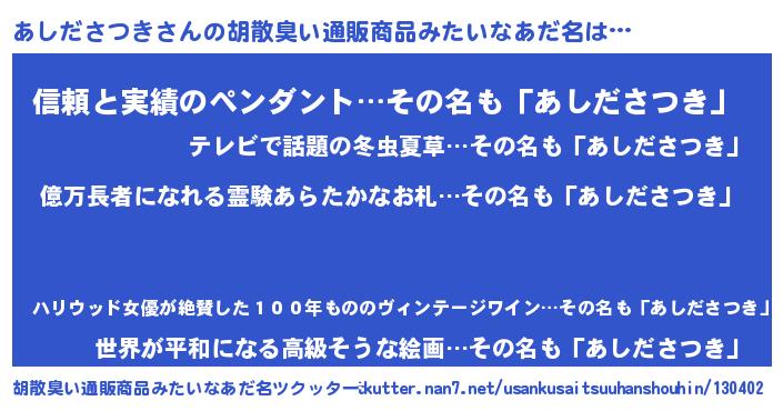 | 伝説のあだ名 | 『封印されしスナイパーあしださつき』 |
