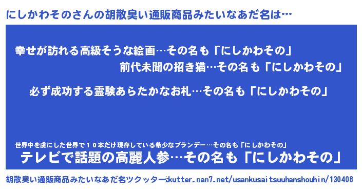 | 肩書あだ名 | 『にしかわその御曹司』 |