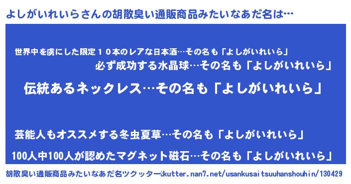 | 男性向けラノベタイトル風あだ名 | 『よしがいれいらの嫁は女の子じゃないと思った?』 |