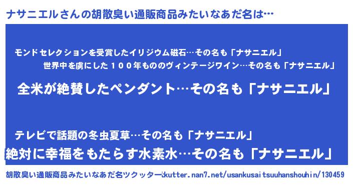 | ヘコむあだ名 | 『ナサぷりん』『ナサニエル(遠い目)』 |