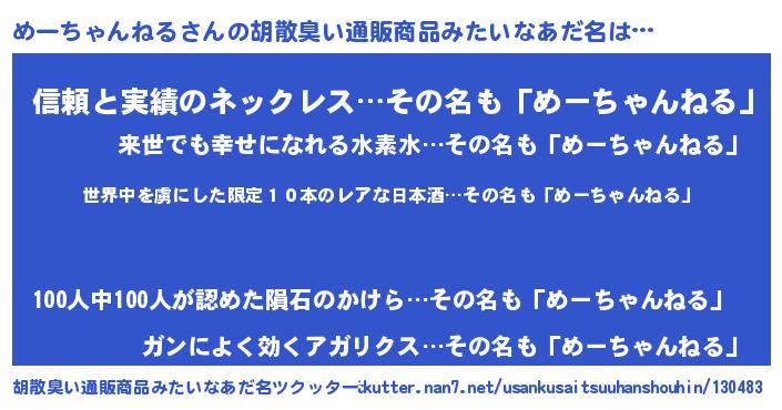 | 男性向けラノベタイトル風あだ名 | 『魔弾の王とめーちゃんねる』 |