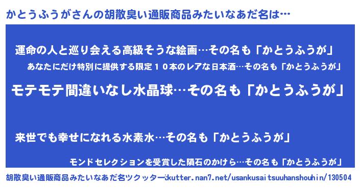 | 男性向けラノベタイトル風あだ名 | 『かとうふうがの憂鬱』 |