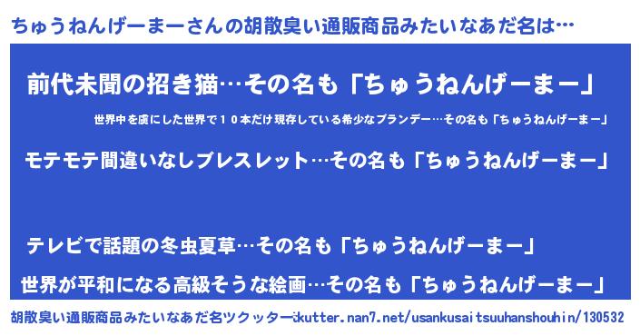 | ヘコむあだ名 | 『ちゅにー』『ちゅうねんげーまー(小並感)』 |