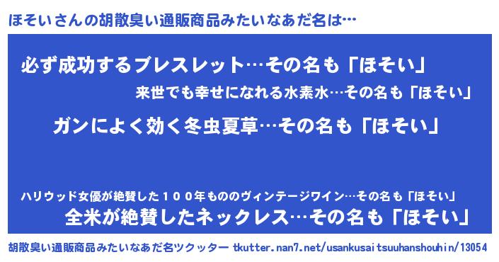 | ヘコむあだ名 | 『ほそもー』『ほそお』『ほそい(笑)』 |