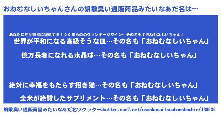| 男性向けラノベタイトル風あだ名 | 『オネムナシイチャンアートオンライン』 |