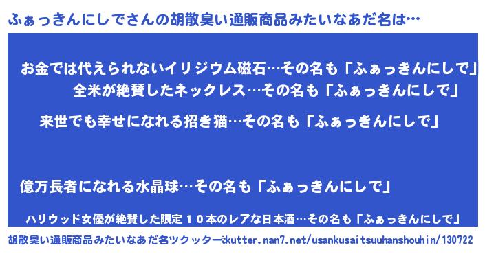 | ヘコむあだ名 | 『ふぁっきんにしで(小並感)』『ふぁっぺ』 |