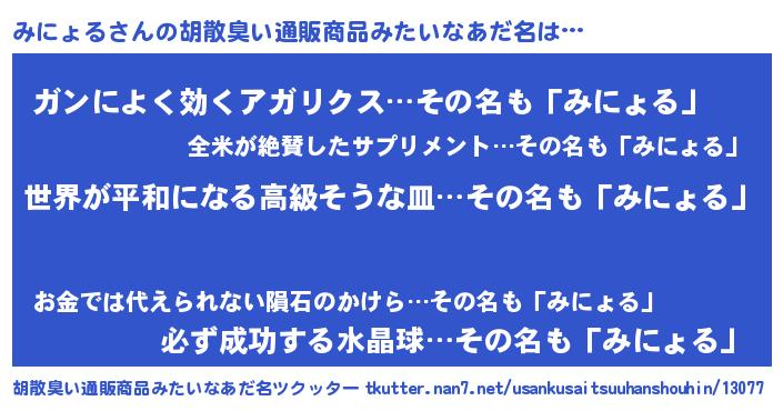 | 意味不明あだ名 | 『なめこ科みにょる属』『自称みにょる』 |