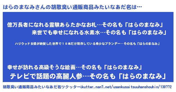 | ヘコむあだ名 | 『はらもー』『はらのまなみ(笑)』 |
