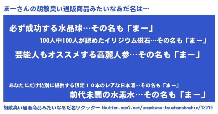 | 男性向けラノベタイトル風あだ名 | 『まー~年齢イコール彼女いない歴の魔法使い~』 |