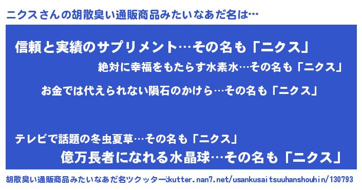 | 女子向けラノベタイトル風あだ名 | 『ニクス恋絵巻』『ニクス様がみてる』 |