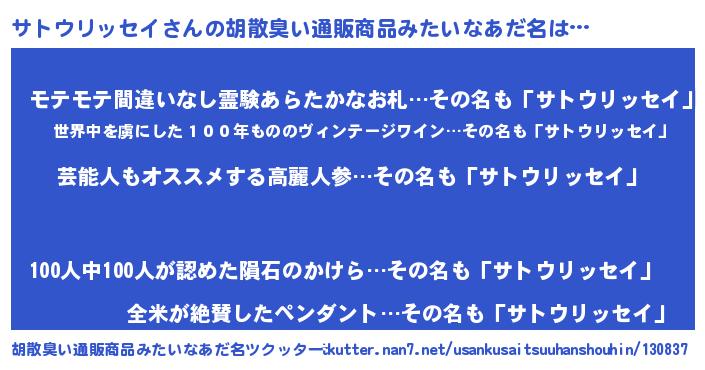 | 男性向けラノベタイトル風あだ名 | 『Re:サトウリッセイから始める異世界生活』 |