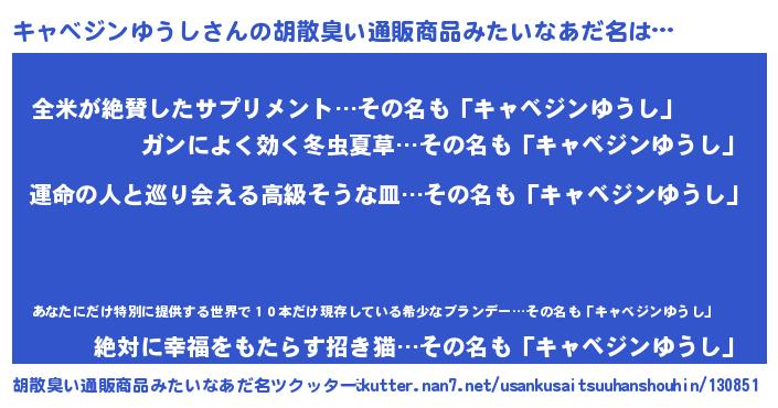 | 男性向けラノベタイトル風あだ名 | 『キャベジンゆうし~年齢イコール彼女いない歴の魔法使い~』 |