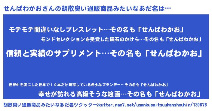| 男性向けラノベタイトル風あだ名 | 『ダンジョンにせんばわかおを求めるのは間違っているだろうか』 |