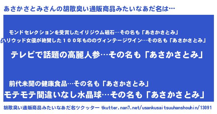 | ヘコむあだ名 | 『あさにー』『あさかさとみ(遠い目)』 |