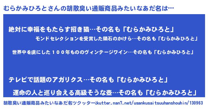 | ヒーロー風カッコイイあだ名 | 『仮面ムラダー』『ネオムラカミヒロト』 |