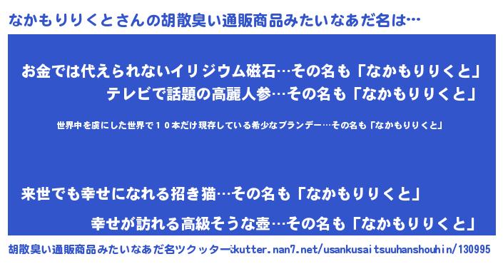 | 意味不明あだ名 | 『住所不定無職なかもりりくと(85歳)』 |