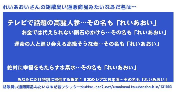 | 男性向けラノベタイトル風あだ名 | 『れいあおい~年齢イコール彼女いない歴の魔法使い~』 |