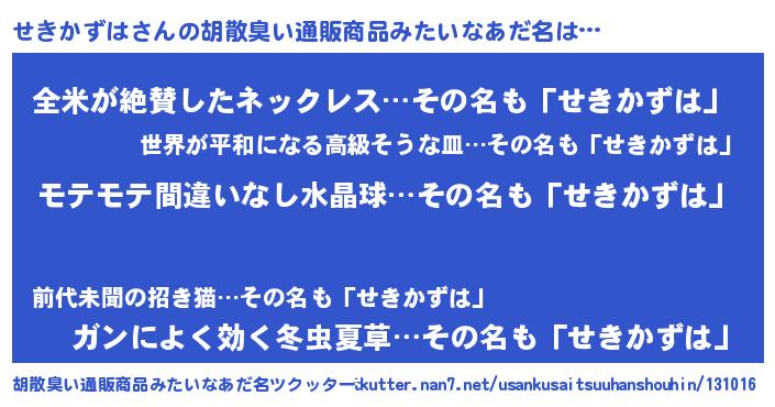 | ヒーロー風カッコイイあだ名 | 『スーパーセキカズハ』『天弓騎士セキ』 |
