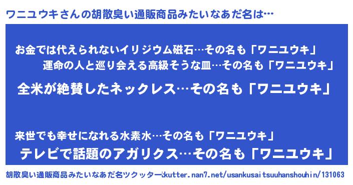 | 男性向けラノベタイトル風あだ名 | 『ワニユウキ~年齢イコール彼女いない歴の魔法使い~』 |