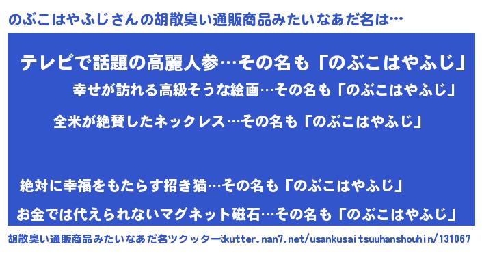 | 男性向けラノベタイトル風あだ名 | 『のぶこはやふじの嫁は女の子じゃないと思った?』 |