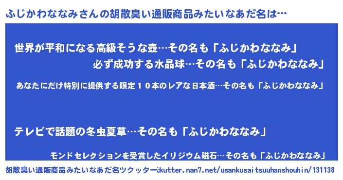 | 男性向けラノベタイトル風あだ名 | 『この素晴らしい世界にふじかわななみを!』 |