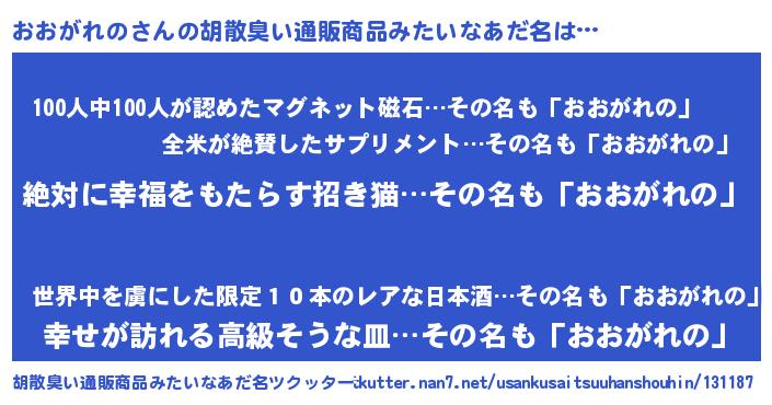 | 男性向けラノベタイトル風あだ名 | 『おおがれのという概念が存在しない退屈な世界 』 |