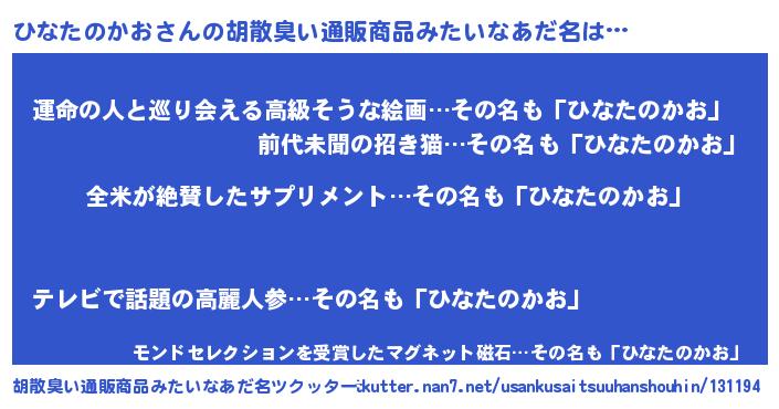 | 男性向けラノベタイトル風あだ名 | 『ひなたのかおの嫁は女の子じゃないと思った?』 |