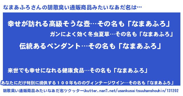 | 男性向けラノベタイトル風あだ名 | 『なまあふろの嫁は女の子じゃないと思った?』 |