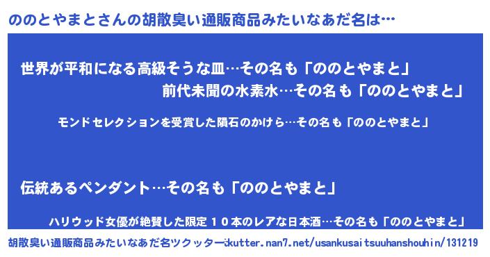 | 男性向けラノベタイトル風あだ名 | 『ノーゲーム・ノーノノトヤマト』 |